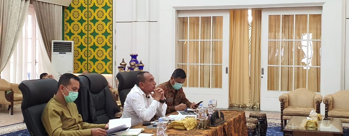 Gubernur Sumatera Utara didampingi wakil Gubernur Sumatera Utara mengikuti Video Confrence dengan Menteri Dalam Negeri, Menteri Keuangan, Menteri Sosial, Menteri Kesehatan dan Kepala BNPB
