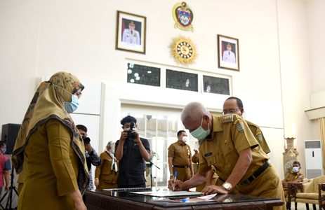 Gubernur Sumatera Utara (Sumut) Edy Rahmayadi melalui Sekretaris Daerah Provinsi (Sekdaprov) Sumut R Sabrina melakukan serah terima pelaksanaan tugas dari Penjabat Sementara (Pjs) Bupati/Walikota se-Sumut ke pejabat lama yang menjalani masa cuti kampanye pemilihan kepala daerah (Pilkada) serentak 2020 pada 10 kabupaten/kota, di Rumah Dinas Gubernur, Jalan Jenderal Sudirman Medan, Senin (7/12).