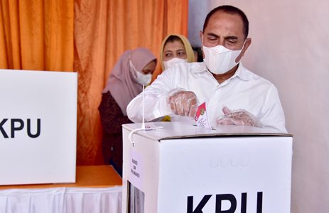 Gubernur Sumatera Utara (Sumut) Edy Rahmayadi bersama keluarga nyoblos atau menggunakan hak pilihnya dalam Pemilihan Kepala  Daerah (Pilkada) Kota Medan, Rabu (9/12) pagi, di  Tempat Pemungutan Suara (TPS) 23 di Jalan Karya Bakti Johor Medan. Selain Kota Medan, ada 22 kabupaten/kota di Sumut yang juga menggelar Pilkada serentak.