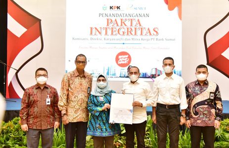 Untuk mencegah tindak pidana korupsi, gratifikasi dan anti fraud (kecurangan), Bank Sumut dan mitra kerja melakukan penandatanganan Pakta Integritas, Rabu (3/2), di Aula Bank Sumut, Jalan Imam Bonjol Nomor 18 Medan. Disaksikan Wakil Ketua Komisi Pemberantasan Korupsi (KPK) Lili Pintauli Siregar dan Direktur Koordinasi Supervisi I KPK Didik Agung Widjanarko.