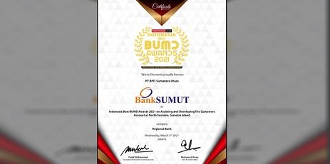 Sebagai penghargaan atas kontribusi pengembangan daerah, inovasi perusahaan dan pelayanan kepada Masyarakat, Bank Sumut berhasil meraih Indonesia Best BUMD Awards 2021 on Assisting and Developing The Customers Account at North Sumatera, Sumatera Island dari Majalah Warta Ekonomi pada penghargaan yang diselenggarakan secara virtual melalui Zoom Meeting Rabu (3/3).