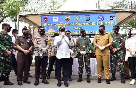 Gubernur Sumatera Utara (Sumut) Edy Rahmayadi bersama Forum Koordinasi Pimpinan Daerah (Forkopimda) mengadakan sosialisasi protokol kesehatan (Prokes) dengan membagikan masker dan handsanitizer di sejumlah pasar di Kota Medan, Selasa (30/3). Antara lain di Pasar Sukaramai dan Pasar Petisah.