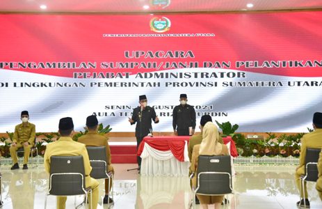 Gubernur Sumatera Utara (Sumut) Edy Rahmayadi melantik 13 pejabat administrator atau eselon III di Lingkungan Pemerintah Provinsi (Pemprov) Sumut, di Aula Tengku Rizal Nurdin, Rumah Dinas Gubernur, Jalan Jenderal Sudirman Nomor 41 Medan, Senin (9/8).