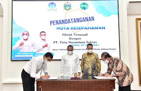 Gubernur Sumatera Utara (Sumut) Edy Rahmayadi meminta Perusahaan Air Minum Daerah (PDAM) Tirtanadi untuk mempercepat memenuhi kebutuhan air masyarakat Kota Medan dan sekitarnya, sebanyak 11.000 liter/detik. Hal tersebut disampaikan Gubernur Edy Rahmayadi usai menyaksikan Penandatanganan Nota Kesepahaman antara Perusahaan Air Minum Daerah (PDAM) Tirtanadi dan PT Tirta Nusantara Sukses di Rumah Dinas Gubernur, Jalan Jenderal Sudirman Nomor 41, Medan, Kamis (29/7). Saat ini, kebutuhan air masyarakat Kota Medan sudah terpenuhi sekitar 7.200 liter/detik dan masih dibutuhkan tambahan sekitar 3.800 liter/detik lagi. [...]